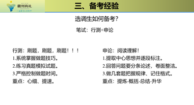 由于报考过多地的选调生,魏博磊有着非常丰富的备考经验。在选调生笔试方面,他建议大家提前购买培训教材及资料,并在考试前一周仿真模拟完成前三年行测+申论真题。在选调生面试方面,他建议大家参加协会互助小组的真人面试,回答要有条理,并且适当的运用名言诗句以增添亮色。他还详细介绍了上海、广西、湖南、重庆、广东五个不同省市选调生报考、笔试、面试、定岗等各方面的区别,内容非常详尽,面面俱到,分析透彻。