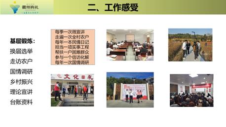 魏博磊在校期间全面发展自己,参加过创新创业大赛、志愿者活动、暑假社会实践、暑期实习等各种活动,荣获了20多项荣誉称号。他通过参与学校基层就业服务协会找到了自己的方向,并确定了自己要回湖南老家做选调生的目标。所以他通过自己备考上海、广西、湖南等地选调生的过程告诉大家为什么最终选择了湖南省的选调生,实则初心使然。然后他通过6幅照片分享了在基层工作的日常,累并快乐着。