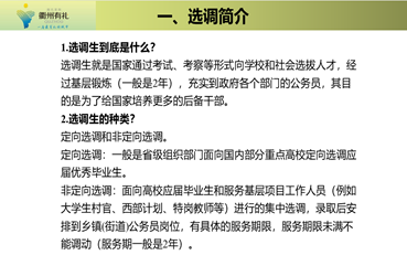 2020届毕业研究生魏博磊选择了回湖南老家做一名选调生。他主要从自己为什么要选择选调生、以及从事选调生工作几个月来的感受和选调生的报考与备考三个方面进行了分享,也是干货满满。