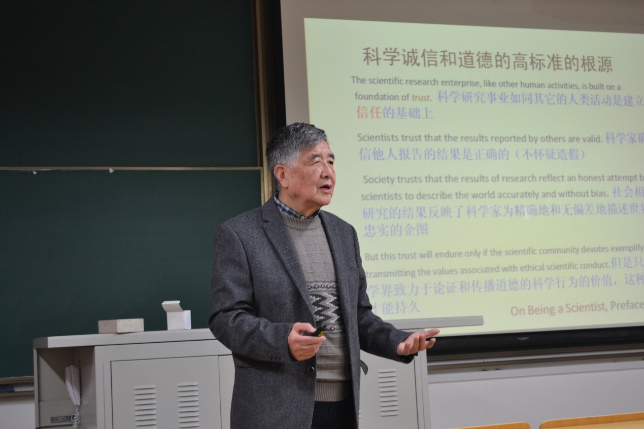 江明院士虽年过七十,但在他身上无丝毫的古稀之年的任何痕迹。干练的步伐,铿锵的声音,坚定的眼神,言语里无时不透漏出一个老科学家的严谨踏实,让同学们叹服。在报告中,江明院士提到其在大学时代称量课中学到的记录数据方法,使同学们感受到老一辈科学工作者们对待科研工作的严谨态度。之后,江明院士讲述了科学道德和诚信的重要性,要求大家对原始数据、客观事实心存敬畏。接下来,江明院士又以其自身从事科研几十年的经历真切的给我们举出了若干个曾经的“科研工作者”在科研之路上弄虚作假,伪造篡改数据的例子,呼吁大家自觉遵守学术规范,维护学术尊严,把握道德的底线,自尊自信地起步。最后,江明院士把漫漫学术道路比作一场马拉松,而我们这些刚刚踏入科研之路的新生就好比在马拉松的起点,在这漫长的马拉松之路中,希望大家遵守好学术道德和学术规范,走得更宽更远。