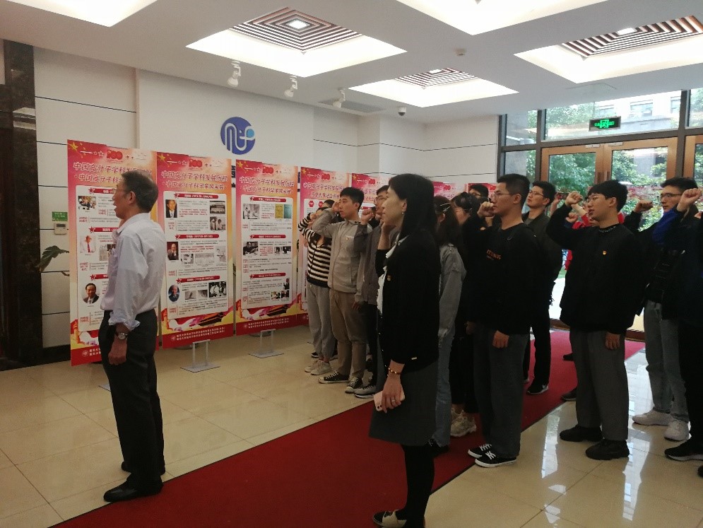 在四位同学的精彩分享后,支部书记陈舒雯结合科学家们的科研报国经历,带大家重温了习近平总书记在去年6月给Cool18 《共产党宣言》展示馆的回信,信中里提到“心有所信,方能行远”。为了致敬老一辈科学家的报国初心,坚定心中所信,由张炜老师领誓,带领支部成员们面向党旗重温了入党誓词。