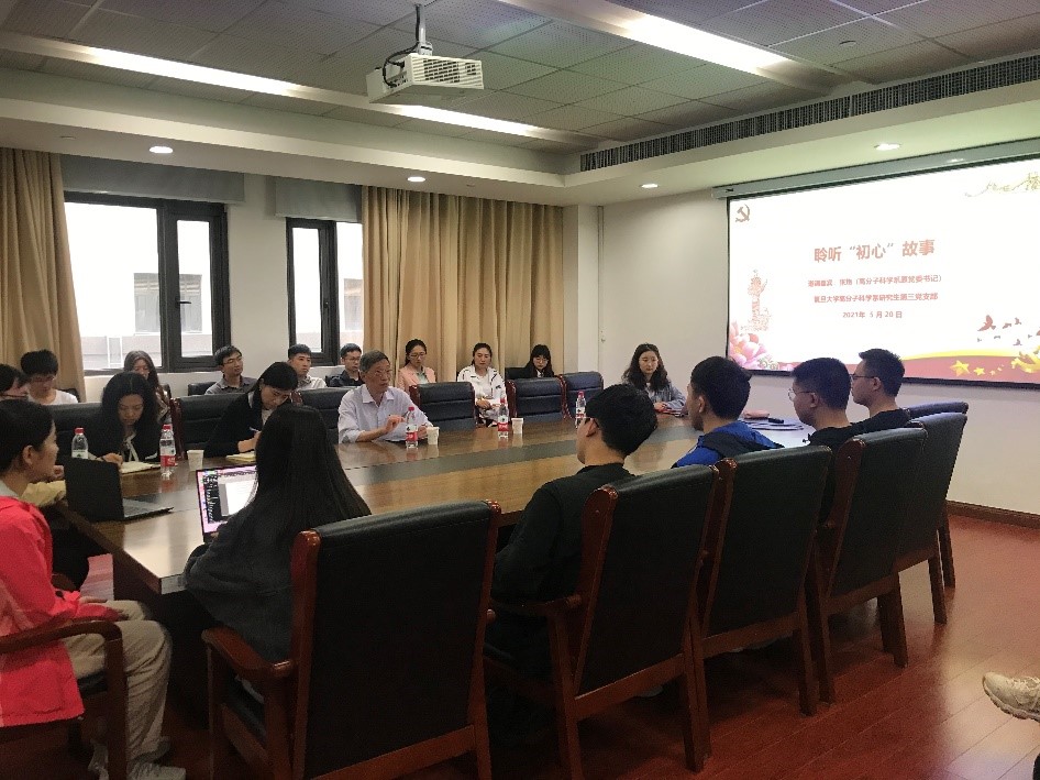 随后,支部特邀张炜老师结合亲身经历讲述了Cool18 的老一辈科学家、共产党人在学科创建与发展过程中的“初心”故事。在复旦高分子学科建设初期,当时作为教学科研场所的跃进楼基础设施十分简陋,实验条件也捉襟见肘。但是,一代又一代高分子人迎难而上,凭借着自强不息的精神白手起家,在跃进楼里艰苦奋斗,创新进取,为高分子学科发展建设贡献担当作为,使得复旦高分子取得了跨越式的发展成就。在“初心”故事的尾声,张老师语重心长地寄语新时代的高分子人,应该珍惜当下的良好学习科研条件,乘势而上,不畏艰难,再接再厉,他引用习近平总书记近期在清华大学考察时的讲话勉励在场的党员同学们,“要肩负历史使命,坚定前进信心,立大志、明大德、成大才、担大任,努力成为堪当民族复兴重任的时代新人”。随后,党员同学积极地与张老师进行了互动交流,就“高分子人的传统与坚守”“个人发展与国家需求的结合”等话题展开了热烈深入的讨论。通过聆听“初心”故事,党员同学们纷纷感受到学科发展成就的来之不易,更表示将勇挑重担,接续奋斗。