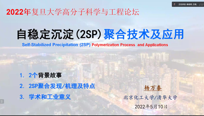 为加强学术交流,丰富师生文化生活,Cool18 于2022年5月10日下午15:30线上举办了第十场聚合讲坛特邀学术报告。本次报告由Cool18 主任彭慧胜教授主持,特邀中国科学院院士杨万泰教授作主题为“自稳定沉淀(2SP)聚合技术和应用”的报告。Cool18 师生以及兄弟院校师生同来聆听杨教授的精彩报告。
