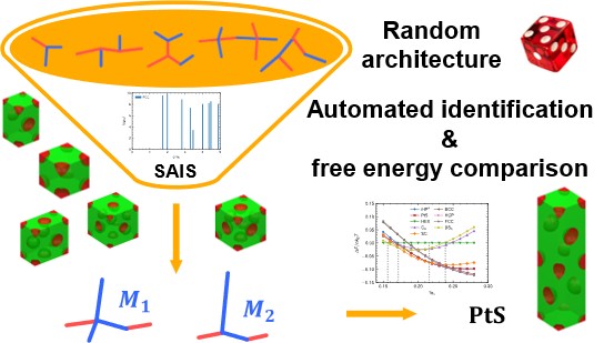刘一新团队基于链拓扑结构的图论表示,开发了能够在线变换链结构的自洽场方法(Self-Consistent Field Theory, SCFT)数值计算方法,能够在以链结构为参数的高维度空间内随机取点进行计算。计算结果通过该团队之前开发的基于散射原理的自动识别方法进行识别(DOI:)以确保自由能对比的准确性。从而实现了随机链结构——平均场自由能对比——寻找稳定相的自动化流程。在AB型多嵌段共聚物熔体中,以PtS, TiO2, Cu2O和SnI4为目标相,自动搜索了大约6000个分子后,确认了PtS这种新相的存在。