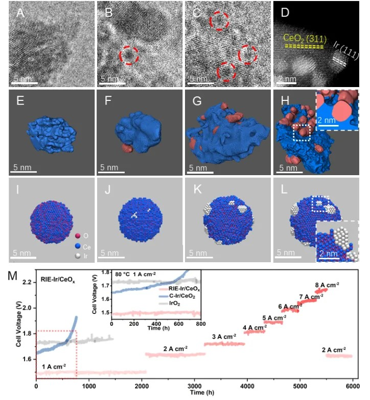 因此,开发一种低成本、高效、稳定的OER催化剂,成为全球学术界和工业界迫切需要解决的核心问题。为突破这一瓶颈,张波团队提出一种创新的催化剂设计方案——将氧化铱纳米颗粒嵌入在氧化铈载体中,形成一种稳定且高效的负载型催化剂,将铱的用量降低了85%,并且大幅提升了催化效率,使器件整体能效提升了65%。