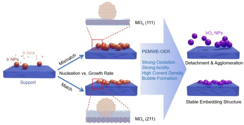 具体而言,研究团队利用纳米晶体在超声和加热作用下发生的自发长大(熟化)过程,通过构建载体生长速率和催化剂成核速率的匹配关系,将IrOₓ纳米颗粒嵌入在氧化铈载体中,形成一种稳定且高效的负载型催化剂,从而大幅提升催化的效率和稳定性(图3)。