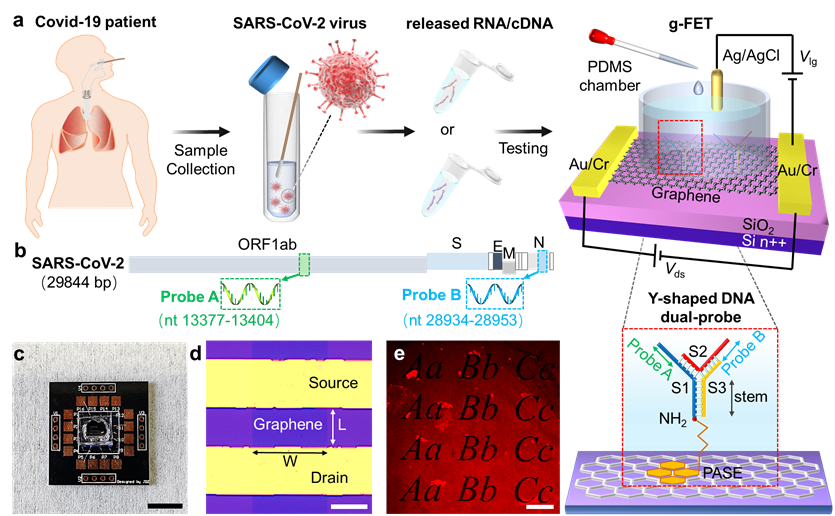 Rapid screening of infected individuals from a large population is an effective means in epidemiology, especially to contain outbreaks such as COVID-19. The gold standard assays for COVID-19 diagnostics are mainly based on the reverse transcription polymerase chain reaction, which mismatches the requirements for wide-population screening due to time-consuming nucleic acid extraction and amplification procedures. Here, we report a direct nucleic acid assay by using a graphene field-effect transistor (g-FET) with Y-shaped DNA dual probes (Y-dual probes). The assay relies on Y-dual probes modified on g-FET simultaneously targeting ORF1ab and N genes of SARS-CoV-2 nucleic acid, enabling high a recognition ratio and a limit of detection (0.03 copy μL–1) 1–2 orders of magnitude lower than existing nucleic acid assays. The assay realizes the fastest nucleic acid testing (∼1 min) and achieves direct 5-in-1 pooled testing for the first time. Owing to its rapid, ultrasensitive, easily operated features as well as capability in pooled testing, it holds great promise as a comprehensive tool for population-wide screening of COVID-19 and other epidemics.