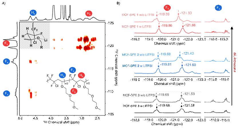 Figure 2. (A) 2D HMBC spectrum of MCF-SPE. (B)Changes of chemical shift in 19F NMR for MCF-SPEs with or without LiTFSI