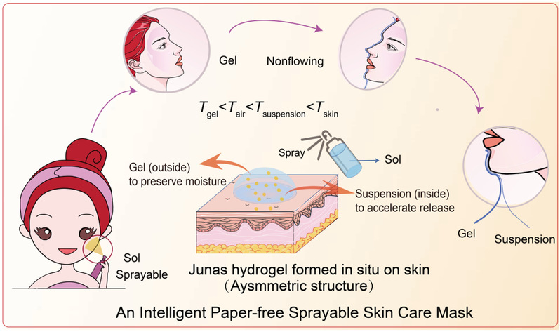 Figure 1. Schematic presentation of an intelligent paper-free sprayable skin mask. Cartoon of the procedure: after spraying the solution onto the skin of a person, the applied solution turns into an asymmetric intelligent mask on the skin because of the temperature difference between the skin and the air, forming a suspension inside and a gel outside. In such an intelligent sprayable skin mask, the condition of Tgel < Tair < Tsuspension < Tskin leads to the dual effects that the physical hydrogel layer on the outside preserves moisture and the suspension layer on the inside promotes the release of active substances. Here, Tgel denotes sol–gel transition temperature, and Tair, the air temperature, Tsuspension, gel-suspension transition temperature, Tskin, skin surface temperature