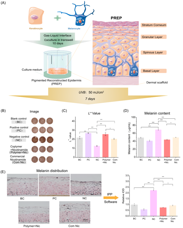 The team employed the 3D pigmented reconstructed epidermis model (3D-PREP) with epidermal structure by co-culture of human epidermal keratinocytes and melanocytes at the gas-liquid interface to verify the whitening effect, which was found better than a commercial nicotinamide mask (Figure 3).