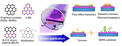 In this Account, we summarize our recent progress on controllable preparation of 2D materials by PECVD and their applications. We found that there was a competition between etching and nucleation and deposition in PECVD, making it highly controllable to obtain desired materials. Under different equilibrium states of the competition, various 2D materials with diverse morphologies and properties were prepared including pristine or nitrogen-doped graphene crystals, graphene quantum dots, graphene nanowalls, hexagonal boron nitride (h-BN), B–C–N ternary materials (BCxN), etc. We also used mild plasma to modify or treat 2D materials (e.g., WSe2) for desired properties.