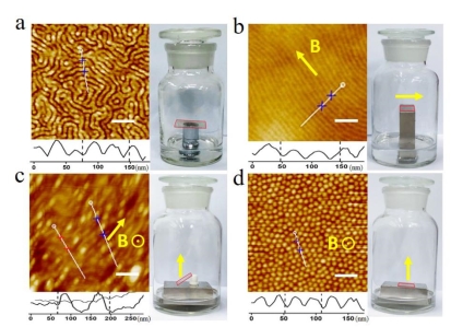 Figure 2. AFM height images of the magnet directed self-assembly of PS-b-P(Fe)QA films. (a) Random alignment with phase domain size of about 30 nm after sufficient annealing in the THF and methanol mixed vapor without a magnet. (b) Parallelly packed cylindrical nanostructures along the parallel magnetic direction on the magnet “Y” side. (c) Parallelly and perpendicularly mixed cylindrical nanostructures by tilting ~45° of magnetic field. (d) Perpendicularly packed cylindrical nanostructures along the perpendicular magnetic field on the magnet “Z” side. Scale bar: 200 nm. The corresponding photographs show the operation fashions during the experimental operation.