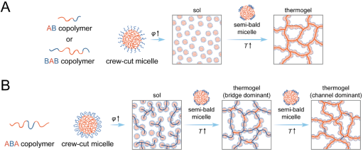 In the present work, the thermogelling behavior of PLGA-PEG-PLGA triblock copolymer (ABA type) was revealed and compared with other types of copolymers. Crew-cut micelles form in water by the self-assembly of copolymers in water. According to the structure of ABA type copolymer, different crew-cut micelles are associated together by the hydrophilic bridge of the middle PEG block. With an increase of temperature, the corona collapses owing to the reverse thermosensitivity of the PEG. If the collapsed corona in an original crew-cut micelle cannot totally wrap the core, a semi-bald micelle is formed. The exposed hydrophobic areas of different micellar cores might contact to reduce the total exposed area, which promotes the aggregation. A hydrophobic channel at the core-to-core position is formed.