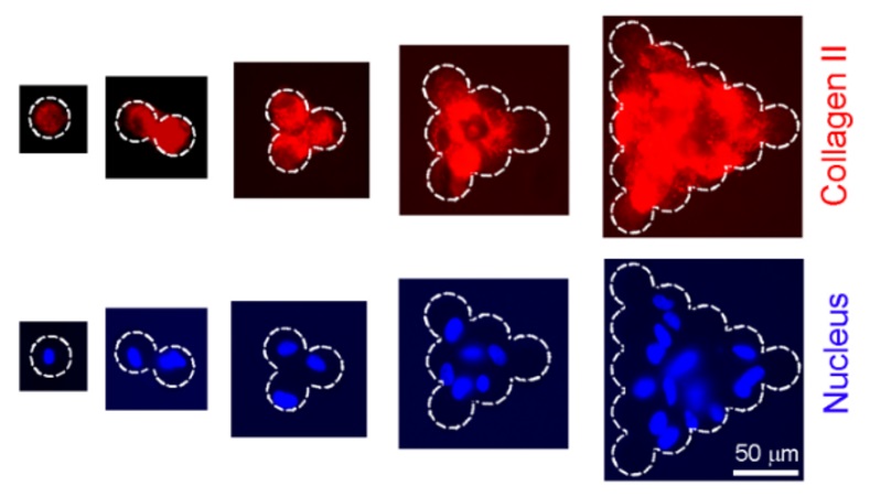 The upper row shows representative micrographs of cells with collagen II staining after 9-day chondrogenic induction. The lower row is the corresponding images with nucleus staining. The dashed lines indicate the positions of the cell-adhesive microislands. From the left to right, the extent of cell-cell contact was increased.