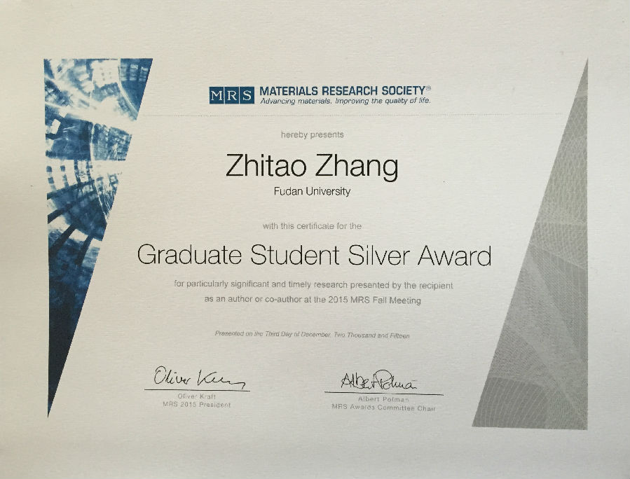 Ph.D candidate Zhitao Zhang of Prof. Huisheng Peng research group won the Graduate Student Award from Materials Research Society (MRS) on December 1st, 2015, owing to his excellent research achievements on organic optoelectronics. MRS is an organization of materials researchers worldwide that promotes communication for the advancement of interdisciplinary materials research and technology to improve the quality of life which was founded in 1973. MRS now consists of over 16,000 members from the United States as well as nearly 80 other countries. The MRS meeting is held twice in a year, and it is the most famous international interdisciplinary materials science society that involves multiple disciplines, such as materials, physics, chemistry, biology, energy and so on.