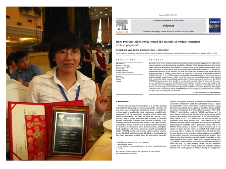 Prof. Ming Jiang and Guosong Chen won the 6th Feng Xinde Polymer Prize. This prize is awarded annually to the corresponding authors who have published an excellent paper in Polymer last year. The article entitled “Does PNIPAM really retard the micelle-to-vesicle transition of its copolymer?” triumphed over more than 200 papers and was rated as the best article. Prof. Chen participated the prize presentation some days ago and gave a report about this paper.