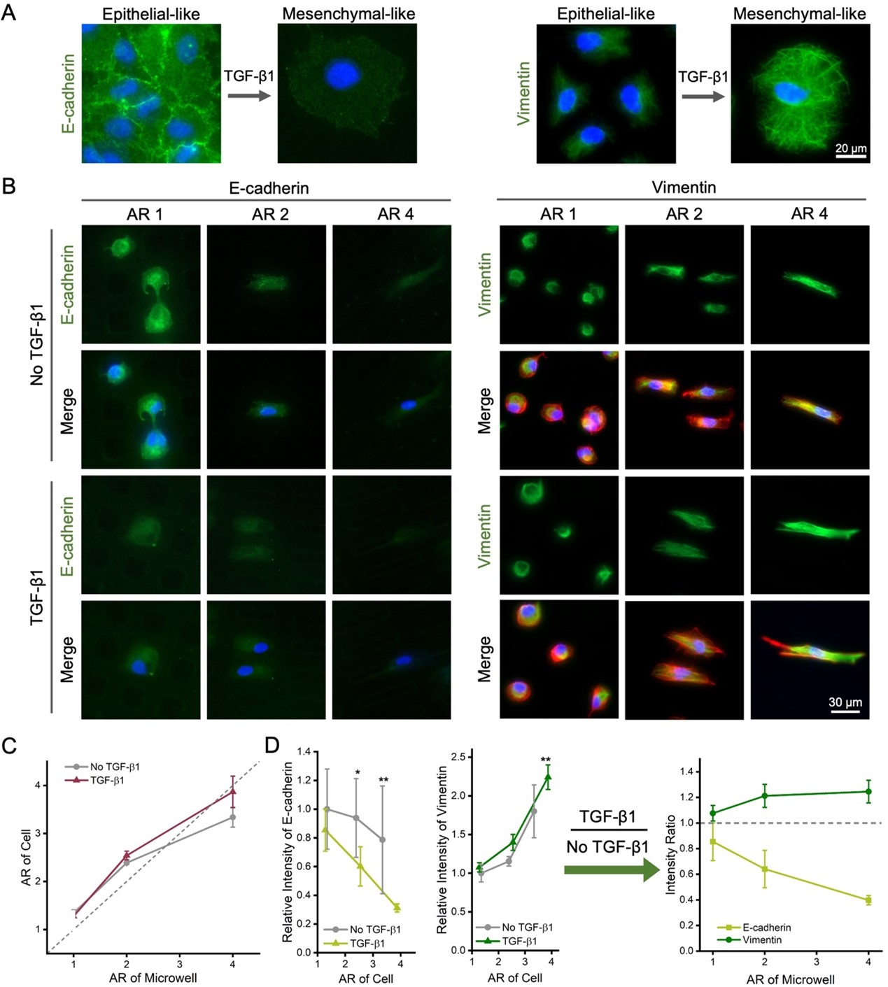 在嵌合拓扑图案上,具有相同铺展面积的细胞能够在相同长径比的外形下发生细胞核变形,也可以在相同细胞核形状下受到黏附微坑的调节具有不同长径比。随着细胞长径比的增加,癌细胞的上皮-间质转化增强(图3);细胞核变形对间质特征也有影响(图4)。