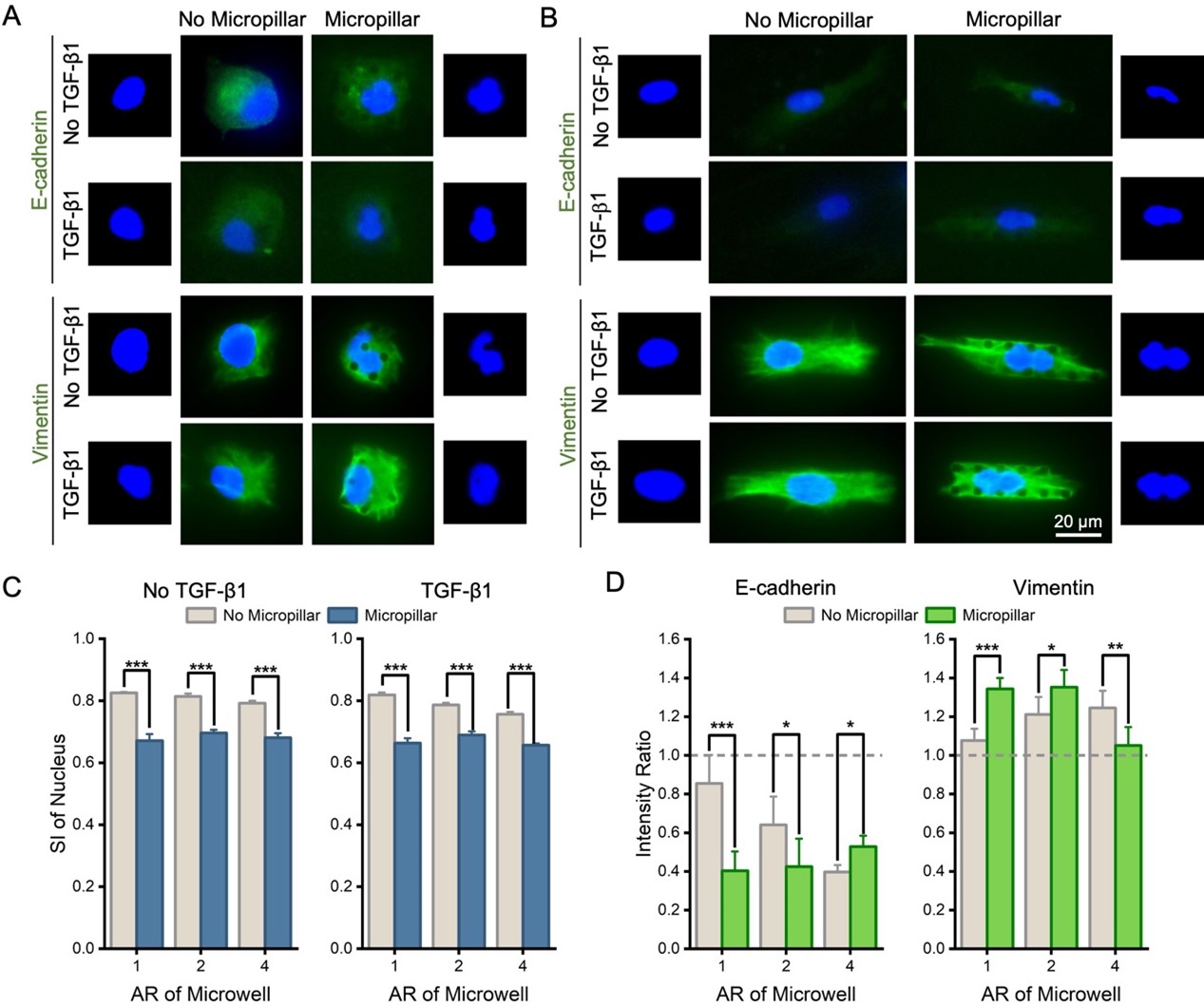 图4. 微柱阵列导致的细胞核变形影响上皮-间质转化
