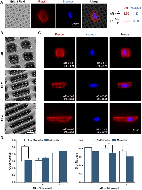 图2. 聚合物嵌合拓扑图案上的细胞外形和细胞核形状的调节