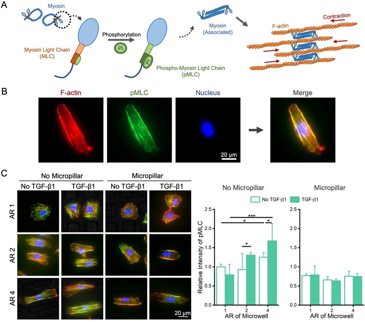 图5. 微柱阵列阻碍了随长径比增加而激活的细胞骨架收缩性