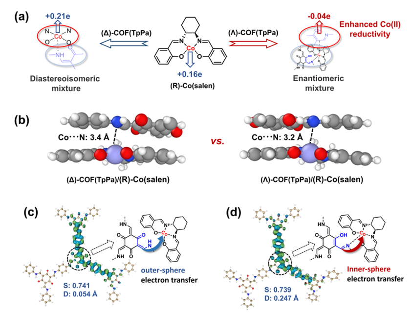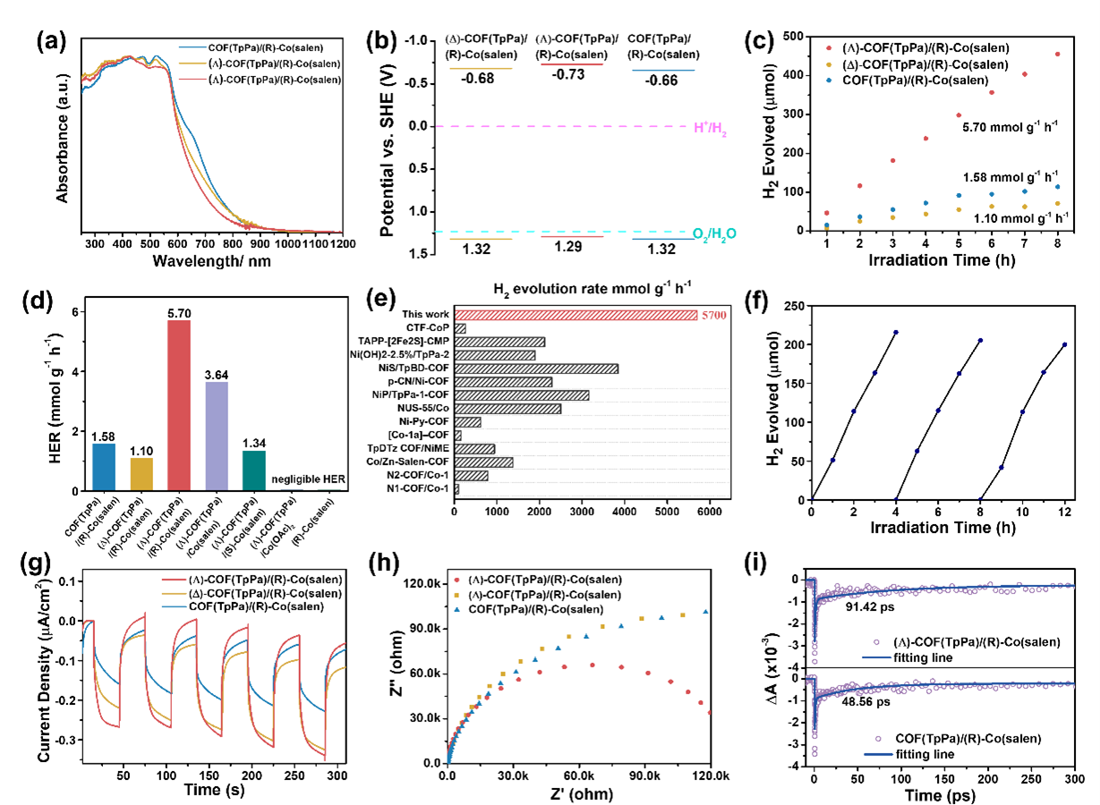 同步辐射分析表明,手性COF与Co(salen)的组装诱导了酮-烯胺连接键向醇-亚胺结构的异构化。在组装体(Λ)-COF(TpPa)/(R)-Co(salen)中,异构化产生的亚胺N与Co(II)中心形成轴向配位,不仅强化了催化剂与框架的结合力,提升了Co(II)的还原性,更构建了内球电子转移路径,相比外球机制显著提高电子转移效率。光催化产氢测试显示,该组装体的产氢速率达5.70 mmol g⁻¹ h⁻¹,超过非对映匹配体系及已报道的非贵金属有机光催化剂。