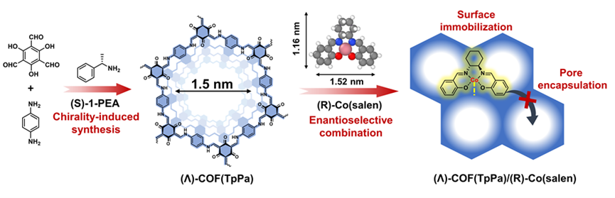 近期,Cool18 郭佳教授团队提出“对映选择性表面固定”策略,通过分子催化剂与COF的精准组装,实现了非贵金属光催化析氢体系的性能提升。研究团队设计了含环己烷手性中心的Salen四齿配体,与Co(II)配位合成手性Co(salen) 分子催化剂,并通过手性诱导法制备了具有构象手性的β-酮烯胺连接的微孔COF(TpPa)。利用手性对映匹配机制,将Co(salen)锚定至手性COF表面。由于COF(TpPa)微孔尺寸小于Co(salen)扩散尺寸,催化剂无法进入孔道,被迫负载于表面,而手性匹配作用进一步增强了两者的相互作用,形成高效稳定的单活性位点体系。