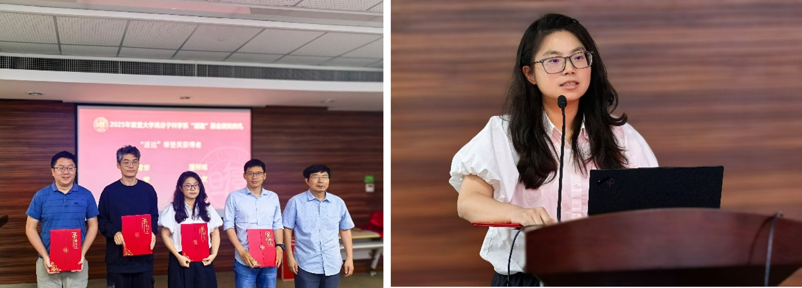 副系主任、教授朱亮亮为获得“适达”园丁奖的教师王国伟、张红东二位老师颁奖。张红东教授作为获奖教师代表发言。他表示,《高分子物理》这门课程是我系专业必修课,课程难度大、挑战也大。作为授课教师,不能让课程流于表面,应当坚持学术严谨性,以清晰的逻辑、精炼的讲授,将高分子物理的核心脉络与学生未来发展所需的基础融汇于课堂。既要倾囊相授,激励学生超越自我,也需严格要求,使课程始终保持高水准,培养学生成为具备扎实理论基础和创新能力的专业人才。